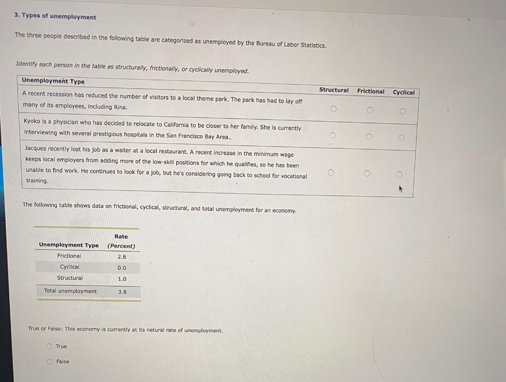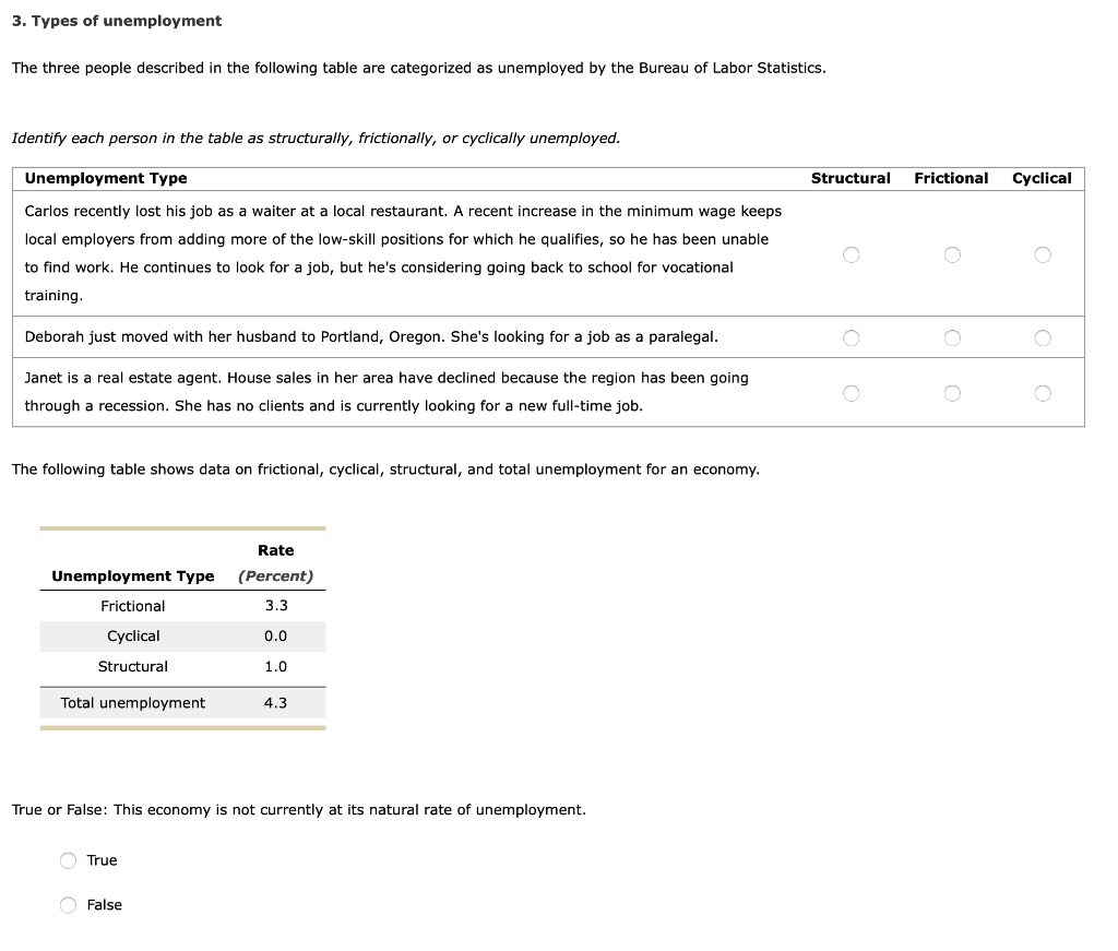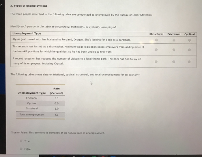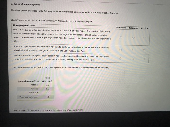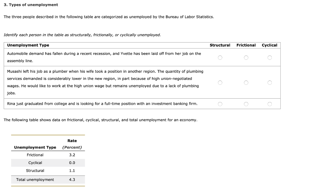 . 3 Types of unemployment The three people described in the following table are categorized as unemployed by the Bureau of Labor Statistics. Identify each person in the table as structurally frictionally or cyclically unemployed. 1 demand deficient 2 frictional 3 structural and 4 voluntary unemployment.